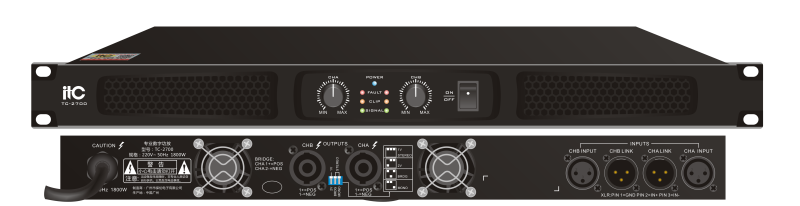 TC-2700 2-канальный профессиональный усилитель, стерео 8 Ом: 2*700 Вт; 4 Ом: 2*1200 Вт; 2 Ом: 2*1800 Вт; Мост 16 Ом: 1400 Вт; 8 Ом: 2400 Вт; 4 Ом: 3600 Вт