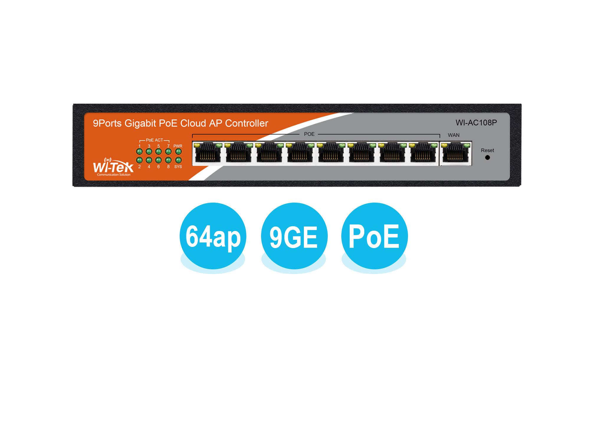 Wi-Tek WI-AС108P — это аппаратный контроллер, предназначенный для централизованной настройки и управления беспроводной сетью на базе точек доступа Wi-Tek. Поддерживаемое количество управляемых точек доступа — до 64 шт. Контроллер имеет 8 портов 1000Base-T с поддержкой PoE и 1 порт 1000Base-T . Управление и настройку контроллера WI-AC108P возможно осуществлять через веб-интерфейс или через Облако Wi-Tek.